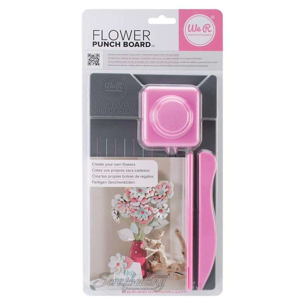 Доска для создания цветов We R Memory Keepers - Flower Punch Board, размер 13х23 см. Позволяет создавать цветы нескольких размеров для ваших открыток или подарков. Включает инструмент для биговки, дырокол, палочку для закручивания лепестков