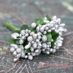 Декоративна гілочка з ягідками сріблястого кольору. У букеті 12 гілочок. На кожній гілочці близько 10 ягідок. Розмір ягоди 4*6мм. Орієнтовна довжина букета близько 90 мм..