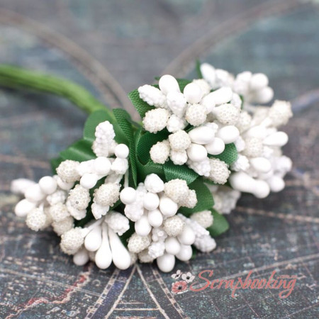 Декоративна гілочка з ягідками білого кольору. У букеті 12 гілочок. На кожній гілочці близько 12 ягідок. Розмір ягоди 4*6мм. Орієнтовна довжина букета близько 90мм