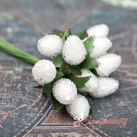 Декоративна гілочка з ягодами у формі суниці білого кольору. У букеті 12 гілочок. На кожній гілочці знаходиться 1 ягода суниці розміром 20*15мм. Орієнтовна довжина букета близько 210мм