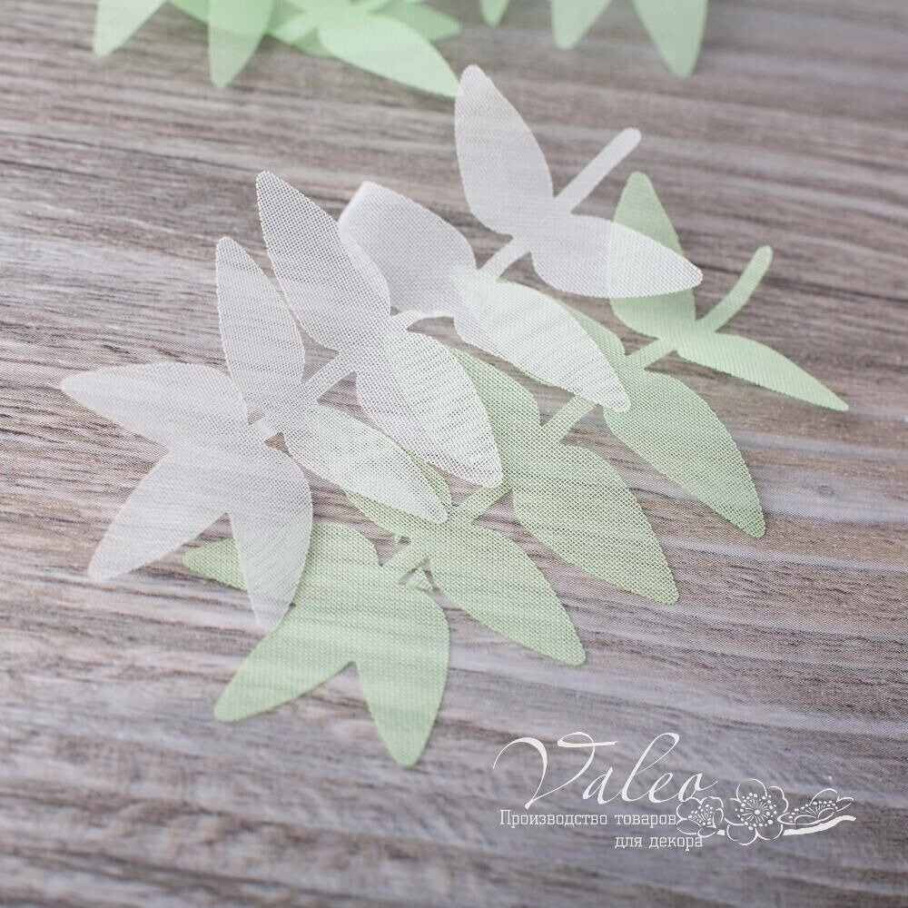 Декоративні тканинні гілочки з листочками від виробника Valeo. В упаковці 10 гілочок салатового та білого кольору. Розмір гілочки 8*4см