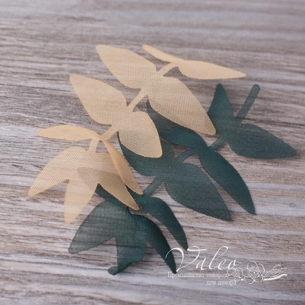 Декоративні тканинні гілочки з листочками від виробника Valeo. В упаковці 10 гілочок тютюнового та зеленого кольору. Розмір гілочки 8*4см