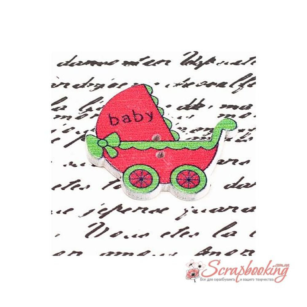 Дерев'яний пофарбований гудзик дитячий візок. Розмір ґудзика 34*32мм. Є отвори для пришивання.