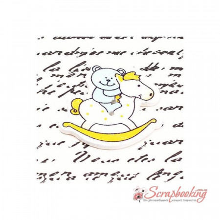 Дерев'яний пофарбований гудзик ведмедик на конячці. Розмір ґудзика 33*31мм. Є отвори для пришивання.