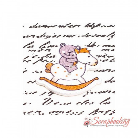 Дерев'яний пофарбований гудзик ведмедик на конячці. Розмір ґудзика 33*31мм. Є отвори для пришивання.