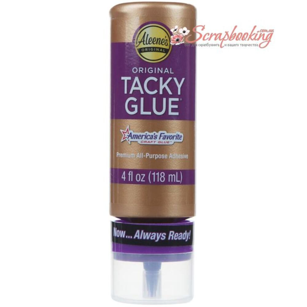 Популярний клей Aleenes Always Ready Original Tacky Glue. Об'єм пляшечки 118мл. Багатоцільовий клей, який застосовується для роботи з папером, тканиною, деревом, пробкою, глітером, бісером та іншими матеріалами та декором. Нетоксична, після висихання прозора, не жовтіє. Водорозчинний. Зручний тонкий носик для акуратного та точного нанесення. У комплекті захисний ковпачок (запобігає засиханню).