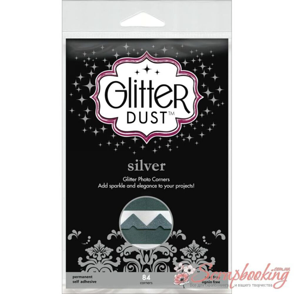 Куточки для кріплення фотографій срібного кольору із гліттером Silver Glitter Dust Photo Corners від виробника Thermoweb. У комплекті 84 кути. Розмір куточків 17*20мм. Для приклеювання не потрібні додаткові клейові матеріали. Архівна якість.