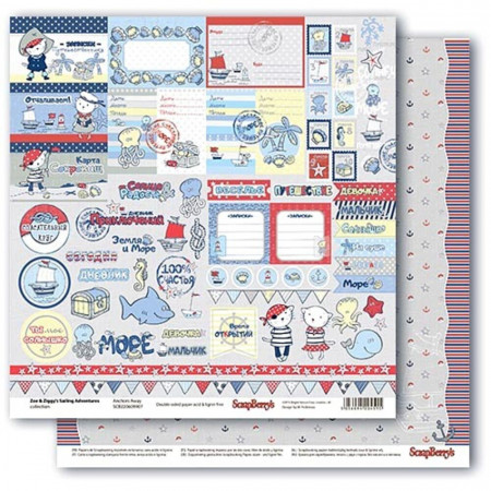 Двусторонний лист бумаги 30*30см плотностью 180гр/м2 из коллекции Морские приключения от производителя ScrapBerry's. Путешествие двух маленьких мышат пиратов Зои и Зиги по морским просторам. Карточки с элементами. Надписи на русском языке. Из этой бумаги получатся прекрасные тематические открытки, детские морские тревел буки, альбомы. Архивное качество.