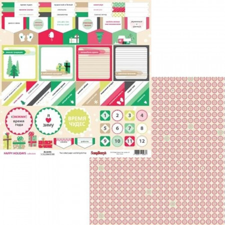 Двусторонний лист бумаги 30*30см плотностью 180гр/м2 из коллекции Зимние каникулы от производителя ScrapBerry's. Новый год в американском стиле и необычном цветовом решении, красный, зеленый, желтый и трендовый крафт. Тема зимнего отдыха, большое количество надписей на русском языке. Архивное качество