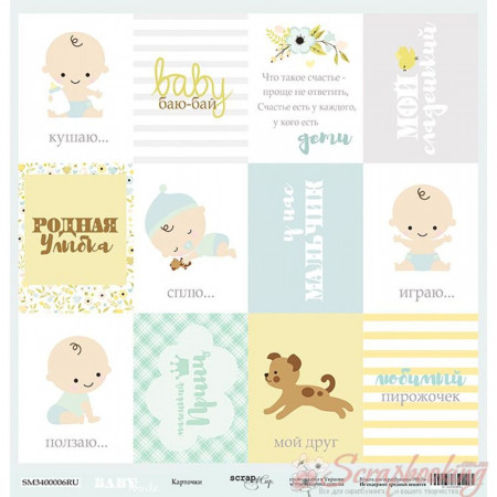 Односторонний лист бумаги 30*30см плотностью 190гр/м2 Карточки на русском из коллекции Smile Baby от производителя Scrapmir. Используется при изготовлении альбомов, открыток, подарочных коробочек. Архивное качество