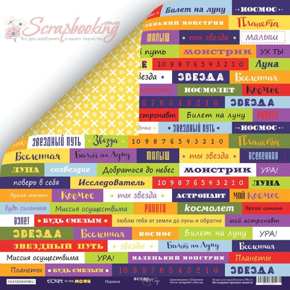 Двусторонний лист бумаги 30*30см плотностью 190гр/м2 Надписи на русском из коллекции Ticket to the Moon от производителя Scrapmir. Используется при изготовлении альбомов, открыток, подарочных коробочек. Архивное качество