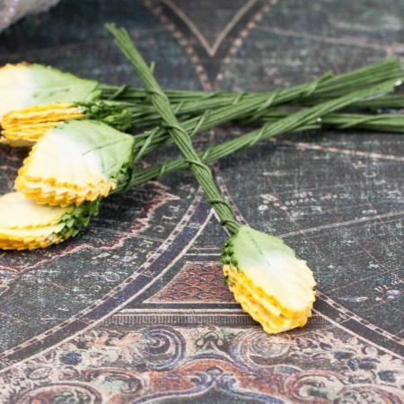Букетик паперових декоративних листочків троянди ручної роботи жовто-зеленого кольору. У букеті 10 листків розміром 18мм на 30мм. Довжина стеблинки близько 50мм