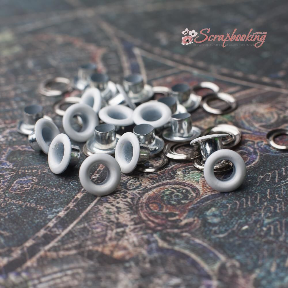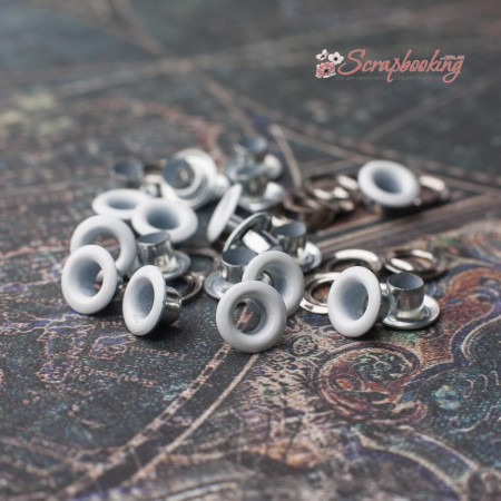 Люверси білого кольору. Кількість в упаковці: 20 шт. Внутрішній діаметр: 5мм. Розмір шапки люверсу: 8мм. Висота люверсу: 5мм