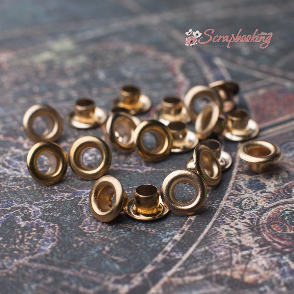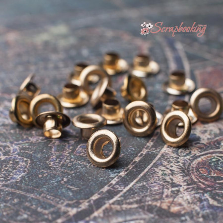 Люверси золотого кольору. Кількість в упаковці: 20 шт. Внутрішній діаметр: 5мм. Розмір шапки люверсу: 8мм. Висота люверсу: 4мм