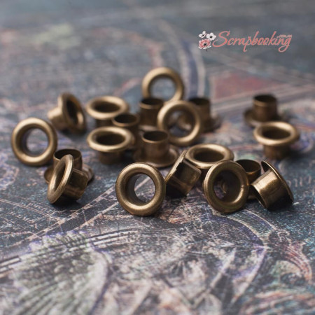 Люверси бронзового кольору. Кількість в упаковці: 20 шт. Внутрішній діаметр: 6мм. Розмір шапки люверсу: 10мм. Висота люверсу: 5мм