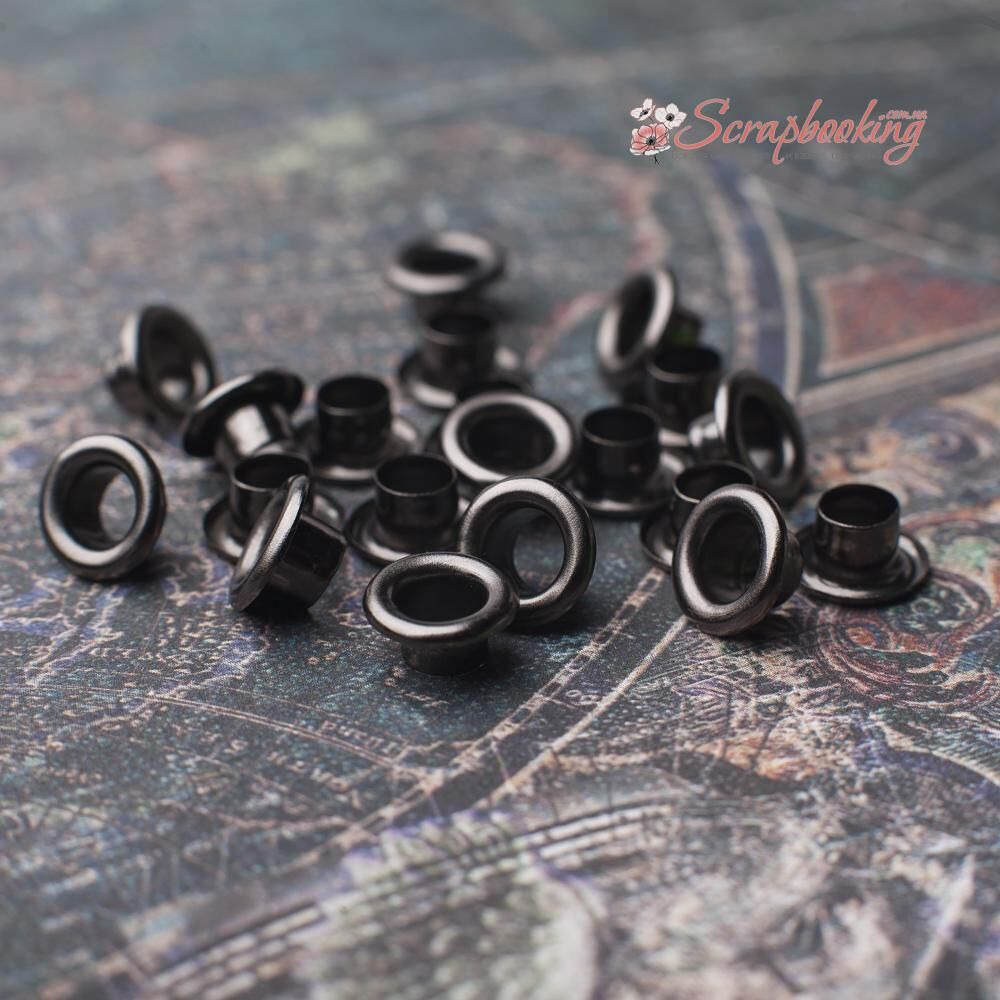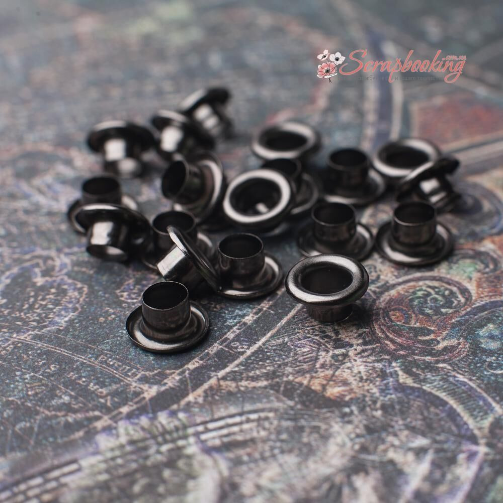Люверси темно-сріблястого кольору. Кількість в упаковці: 20 шт. Внутрішній діаметр: 6мм. Розмір шапки люверсу: 10мм. Висота люверсу: 5мм