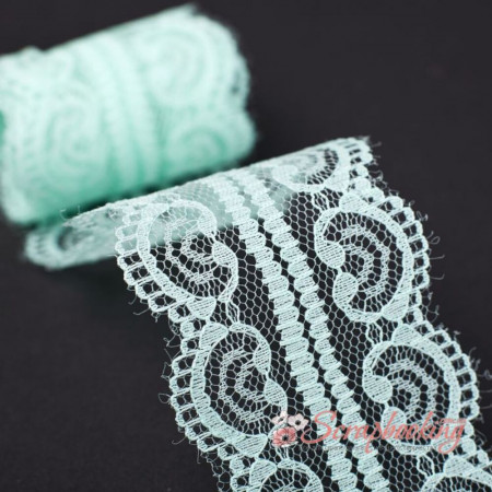 Декоративне мереживо стрічка ментолового кольору. Ширина мережива 50мм. Ціна вказана за 1 метр. Використовується для оформлення листівок та альбомів, для упаковки подарунків, при декоруванні предметів інтер'єру