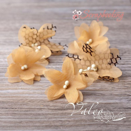 Декоративні тканинні ручної роботи Магнолії від виробника Valeo. В упаковці 5 квіток тютюнового кольору розміром 4см.