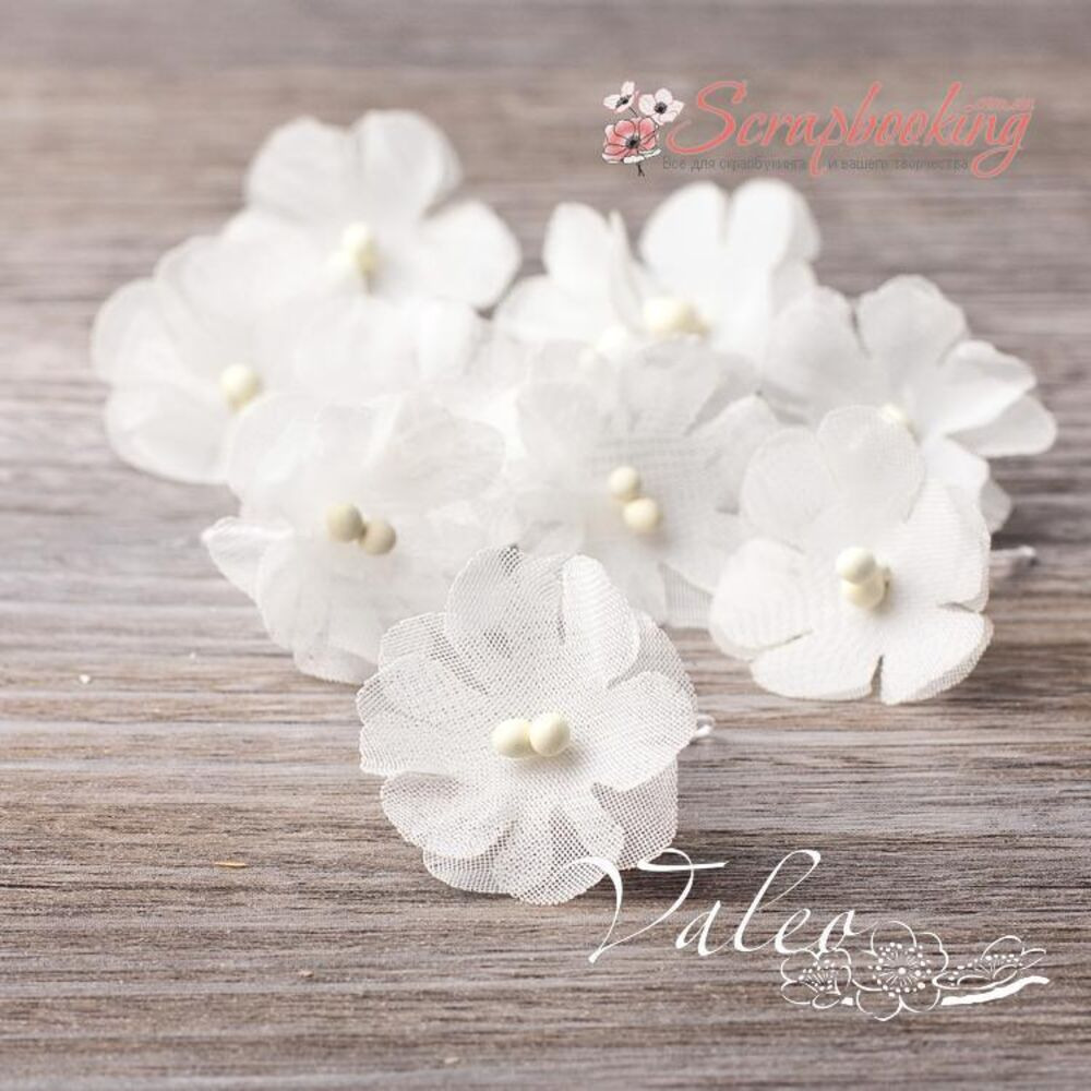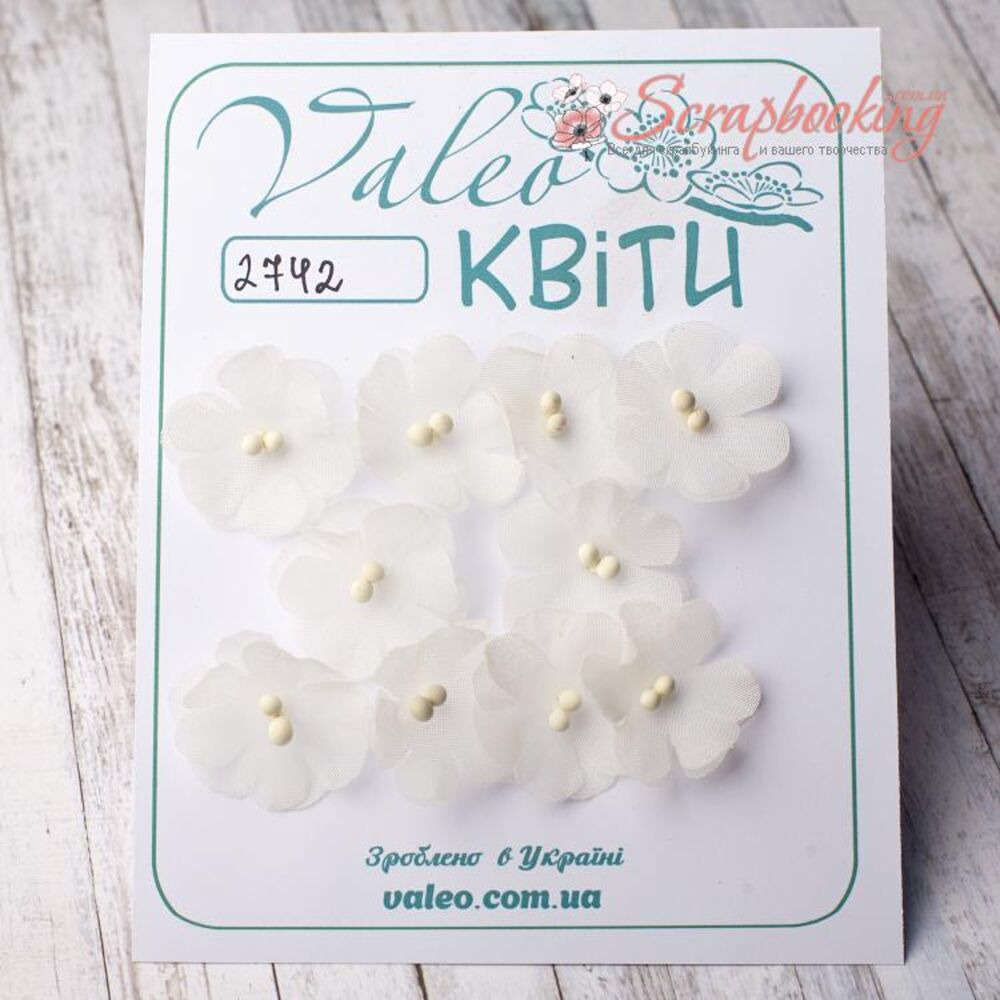 Декоративні тканини Незабудки ручної роботи від виробника Valeo. В упаковці 10 квіток білого кольору розміром 2.5 см.