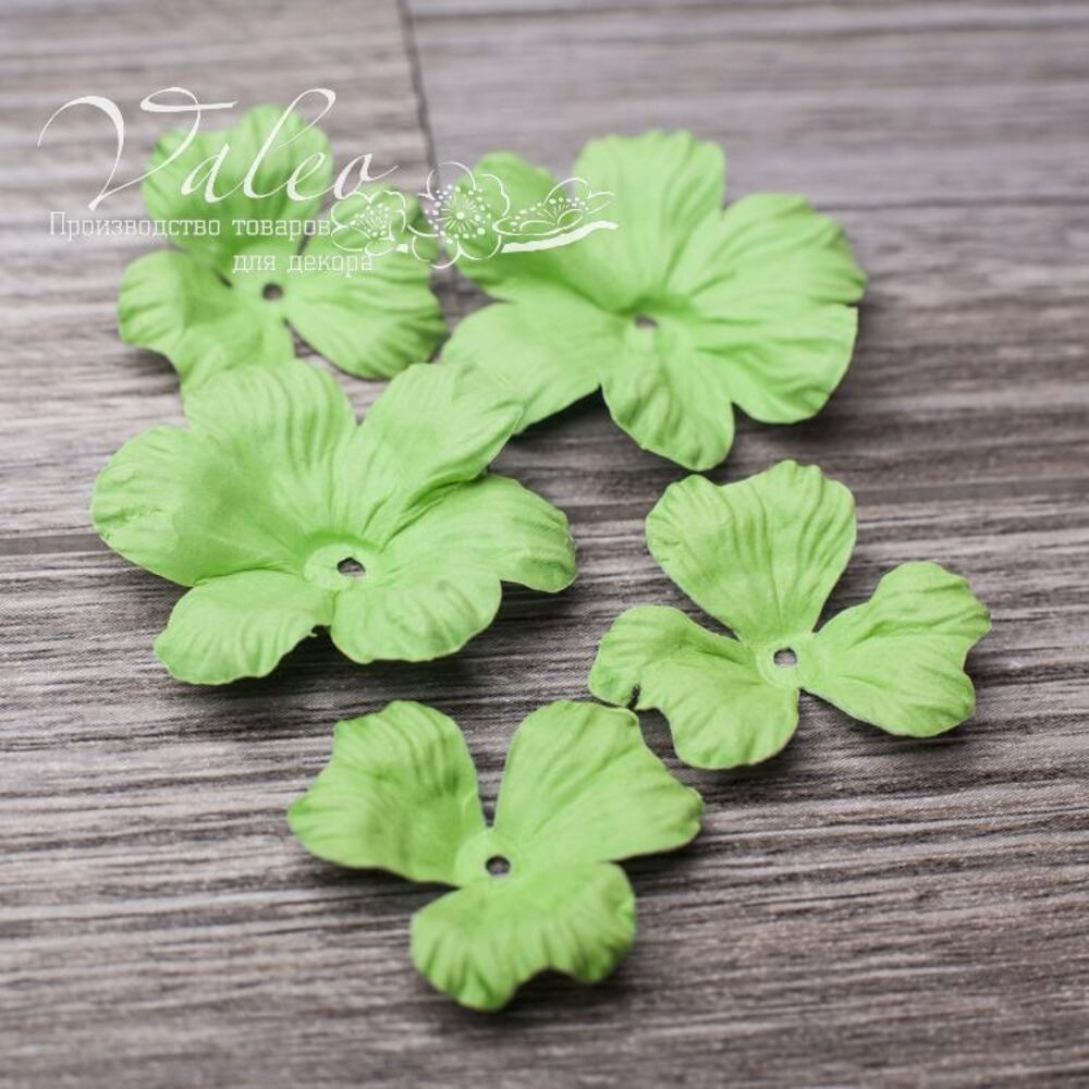 Паперові квіти від виробника Valeo. У наборі 2 квітки 40мм та 3 квітки 30мм зеленого кольору. Прекрасна прикраса для запрошень, листівок, сторінок альбомів.