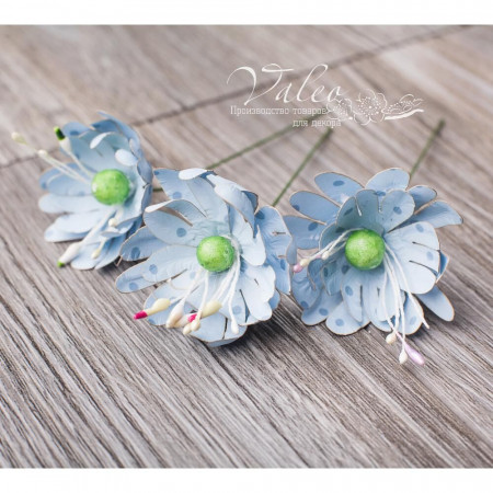 Паперові квіти від виробника Valeo. У наборі 3 квітки розміром 40мм із принтом горох блакитного кольору. Прекрасна прикраса для запрошень, листівок, сторінок альбомів.