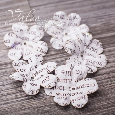 Паперові квіти від виробника Valeo. У наборі 5 квіток із малюнком газета розміром 40мм. Прекрасна прикраса для запрошень, листівок, сторінок альбомів.