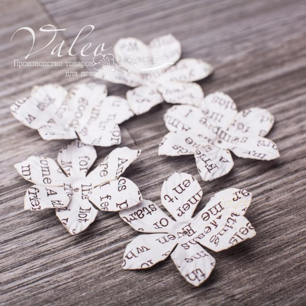 Паперові квіти від виробника Valeo. У наборі 5 квіток із малюнком газета розміром 40мм. Прекрасна прикраса для запрошень, листівок, сторінок альбомів.