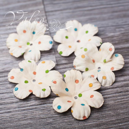 Паперові квіти від виробника Valeo. У наборі 5 квіток бежевого кольору із малюнком горох розміром 40мм. Прекрасна прикраса для запрошень, листівок, сторінок альбомів.