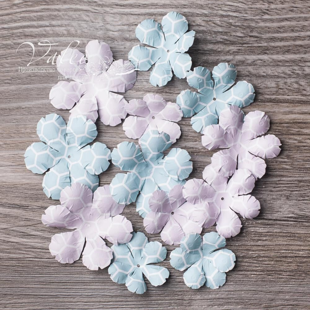 Паперові квіти від виробника Valeo. У наборі 4 квітки 45мм, 4квітки 35мм та 4 квітки 35мм пастельних відтінків з візерунком. Прекрасна прикраса для запрошень, листівок, сторінок альбомів.
