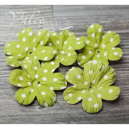 Паперові квіти від виробника Valeo.У наборі 5 квіток оливкового кольору із малюнком горох розміром 50мм. Прекрасна прикраса для запрошень, листівок, сторінок альбомів.