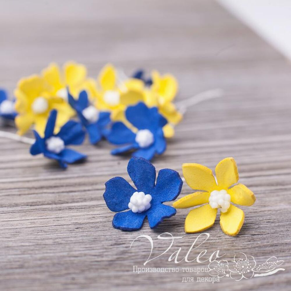 Набір польових кольорів ручної роботи із фоамірану українського виробника декору Valeo. У наборі 12 квіточок жовтого, синього кольору розміром 20*20мм. Прекрасна прикраса для запрошень, листівок, сторінок альбомів.