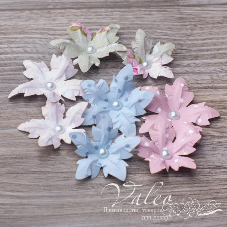 Набір паперових пуансетій рожевого, блакитного, оливкового та світло-рожевого кольору українського виробника декору Valeo. У наборі 4 пуансетті розміром 40мм і 4 пуансетті розміром 50мм. Прекрасна прикраса для запрошень, листівок, сторінок альбомів.