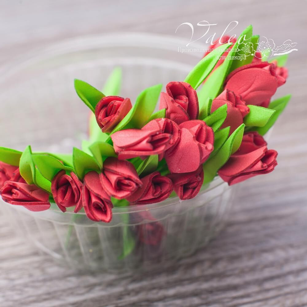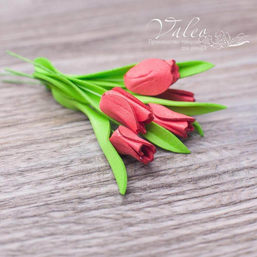 Набір тюльпанів ручної роботи із фоамірану українського виробника декору Valeo. У наборі 5 квіточок червоного кольору розміром 8*18мм. Прекрасна прикраса для запрошень, листівок, сторінок альбомів.