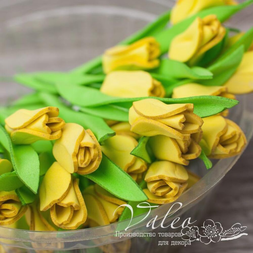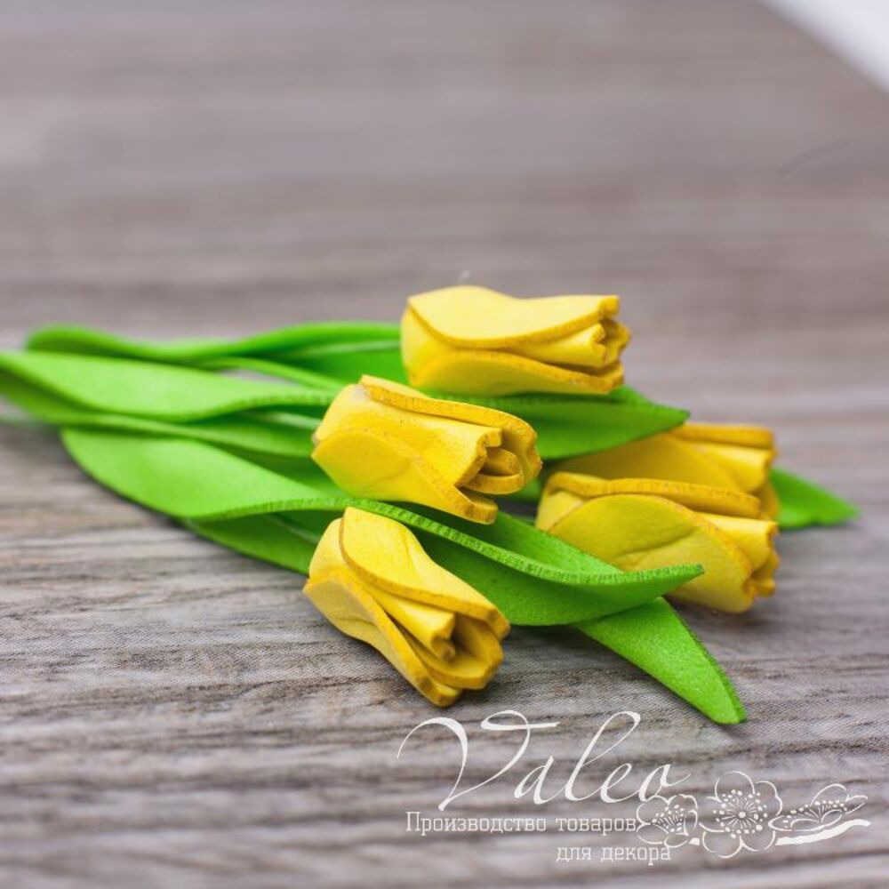 Набір тюльпанів ручної роботи із фоамірану українського виробника декору Valeo. У наборі 5 квіточок жовтого кольору розміром 8*18мм. Прекрасна прикраса для запрошень, листівок, сторінок альбомів.