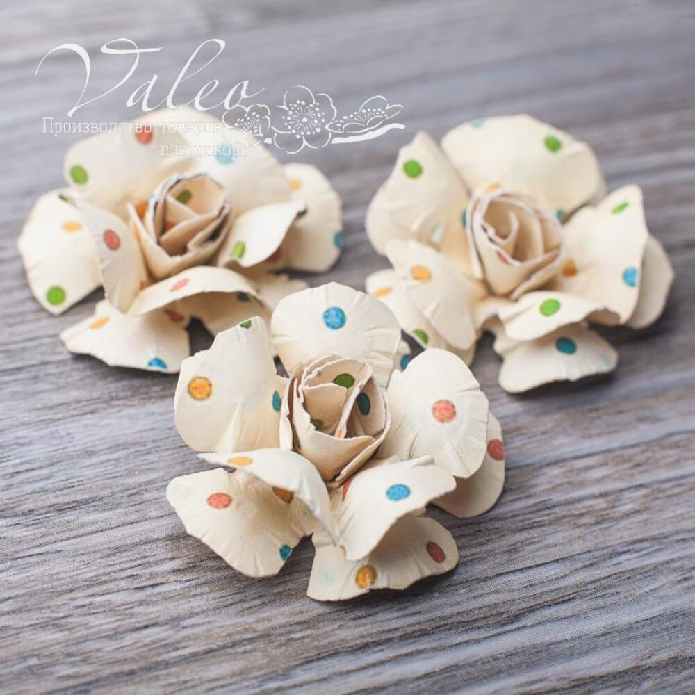 Набір паперових троянд бежевого кольору з малюнком горох українського виробника декору Valeo. Розмір квітки 40мм. У наборі 3 троянди. Прекрасна прикраса для запрошень, листівок, сторінок альбомів.