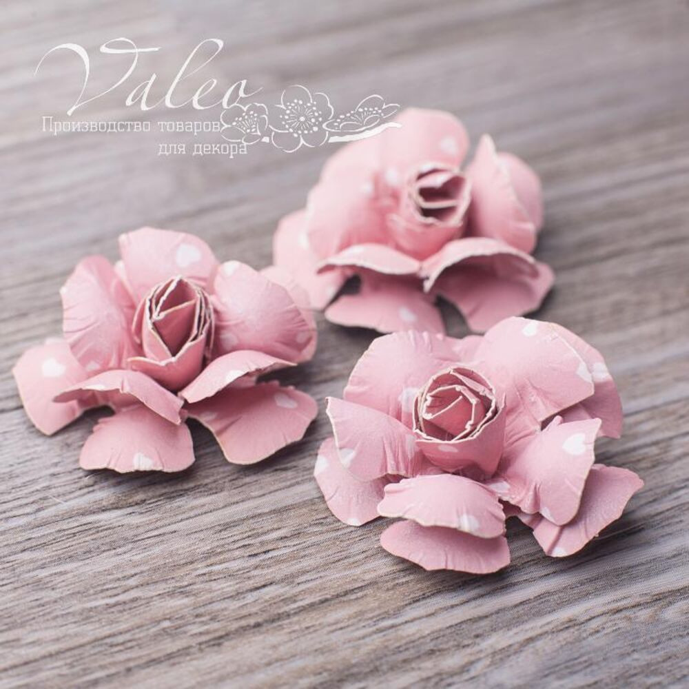 Набір паперових троянд рожевого кольору з малюнком серця українського виробника декору Valeo. Розмір квітки 40мм. У наборі 3 троянди. Прекрасна прикраса для запрошень, листівок, сторінок альбомів.
