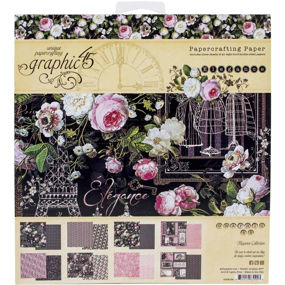 Набір паперу для скрапбукінгу розміром 20*20см Elegance від виробника Graphic 45. У наборі 8 аркушів із двостороннім друком. Щільність паперу 180гр/м2. Архівна якість.
