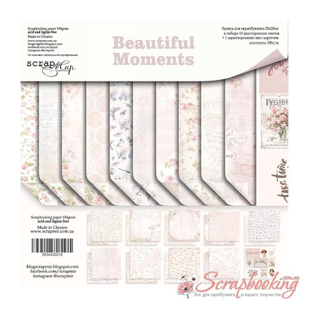Набір двостороннього паперу щільністю 190гр/м2 Beautiful Moments розміром 20*20см від виробника Scrapmir. Підібрані за тематикою аркуші паперу дозволять Вам легко та невимушено виготовити альбом. Архівна якість.