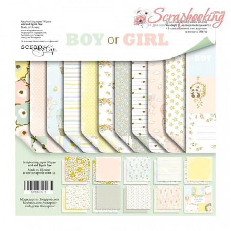 Набір двостороннього паперу щільністю 190гр/м2 Boy or Girl розміром 20*20см від виробника Scrapmir. Набір містить 10 аркушів двостороннього паперу та один аркуш одностороннього паперу з картками англійською мовою. Підібрані за тематикою аркуші паперу дозволять Вам легко та невимушено виготовити альбом. Архівна якість.