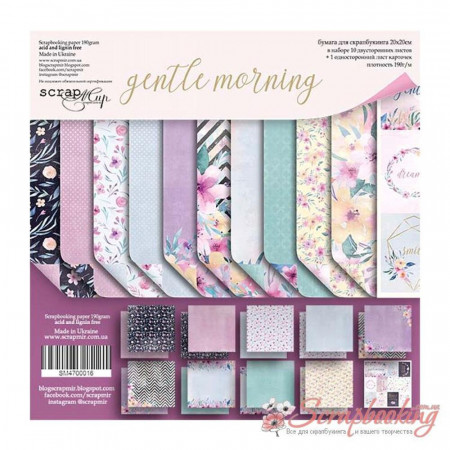 Набір двостороннього паперу щільністю 190гр/м2 Gentle Morning розміром 20*20см від виробника Scrapmir. Набір містить 10 аркушів двостороннього паперу та один аркуш одностороннього паперу з картками англійською мовою. Підібрані за тематикою аркуші паперу дозволять Вам легко та невимушено виготовити альбом. Архівна якість.