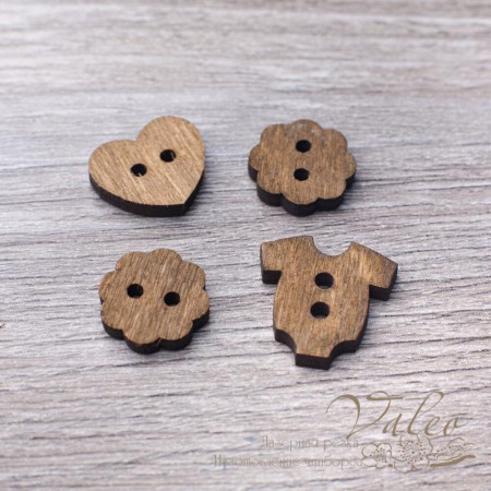 Набір дерев'яних ґудзичок коричневого кольору. Розмір ґудзичок 16...27мм. В упаковці 4 ґудзички