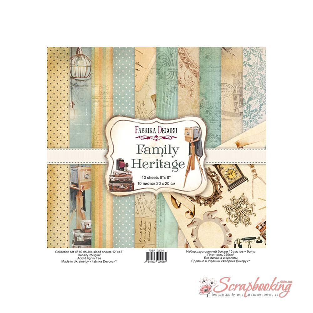 "Family Heritage"- набор двусторонней бумаги для скрапбукинга с размерами сторон 20см х 20см (8"x8") плотностью 200г/м.