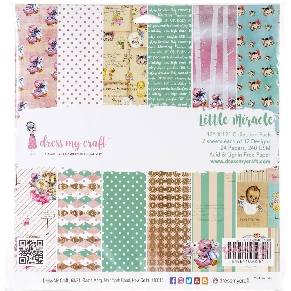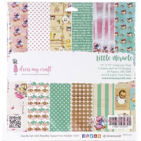 Набор бумаги для скрапбукинга размером 30*30см Little Miracle от производителя Dress My Crafts. В наборе 12 листов с односторонней печатью. Плотность бумаги 240гр/м2. Архивное качество.