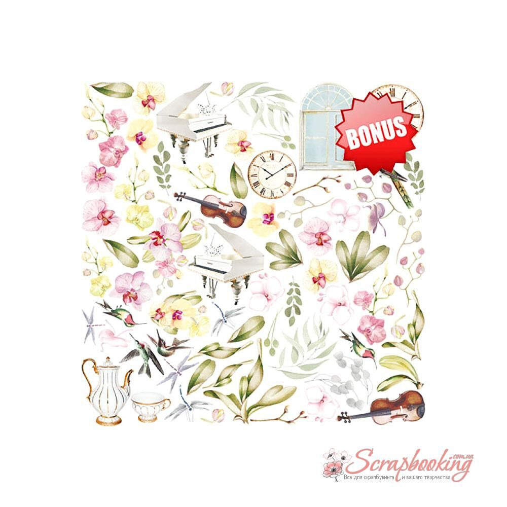 "Orchid song"- это набор двусторонней бумаги для скрапбукинга с размерами сторон 30,5см х 30,5см (12"x12"), плотностью 200г/м.