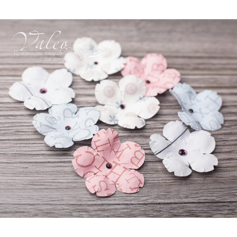 Бумажные цветы от производителя Valeo. В наборе 8 цветков с декоративным рисунком и стразами размером 35мм. Прекрасное украшение для пригласительных, открыток, страничек альбомов.