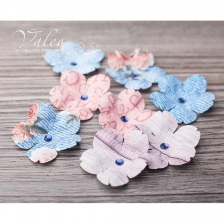 Бумажные цветы от производителя Valeo. В наборе 8 цветков с декоративным рисунком и стразами размером 35мм. Прекрасное украшение для пригласительных, открыток, страничек альбомов.
