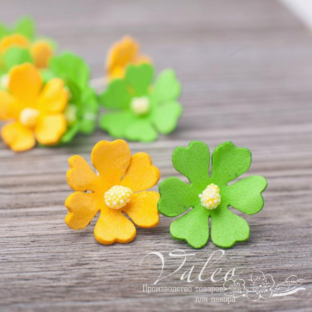 Набор полевых цветов ручной работы из фоамирана украинского производителя декора Valeo. В наборе 12 цветочков желтого, салатового цвета размером 20*20мм. Прекрасное украшение для пригласительных, открыток, страничек альбомов.