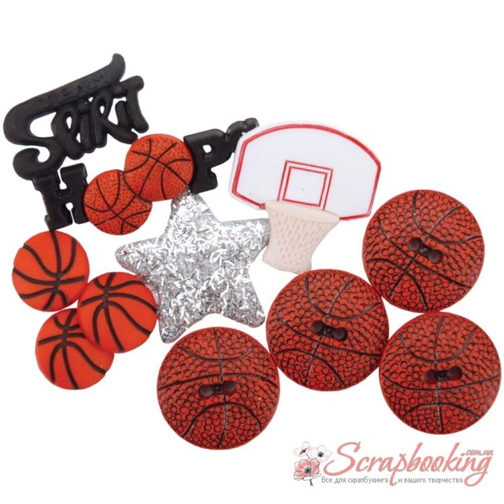 Набор декоративных пуговиц на спортивную тематику от производителя Jesse James. Размер упаковки 7*5см. Размеры пуговичек в среднем от 1.5см до 3см
