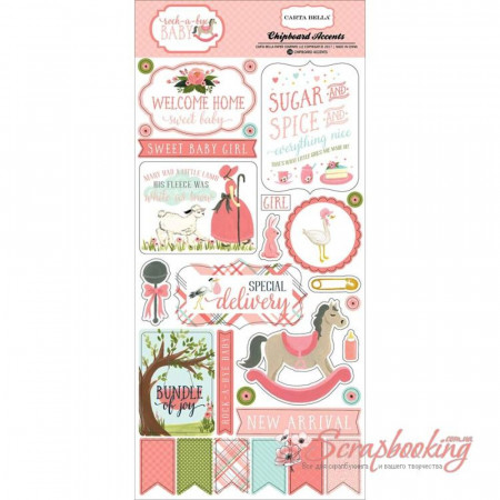 Наклейки із щільного чіпборду з дитячої колекції для дівчинки Rock-A-Bye Baby Girl виробника Carta Bella. Наклейки розташовані на аркуші розміром 15*33см. Для приклеювання не потрібні додаткові клейові матеріали. Наклейки архівної якості.