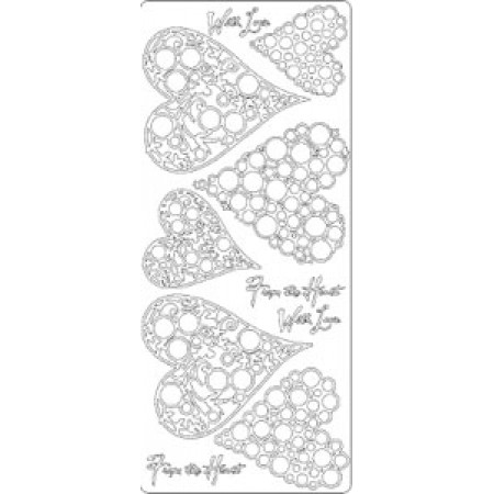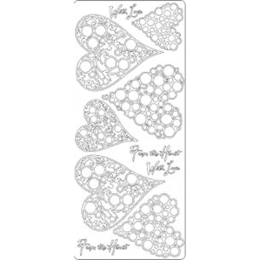 Тематичні контурні наліпки "Сердечки" срібного кольору. Розмір листа наліпок 10*23см. Для приклеювання не потрібні додаткові клейові матеріали. Архівна якість.